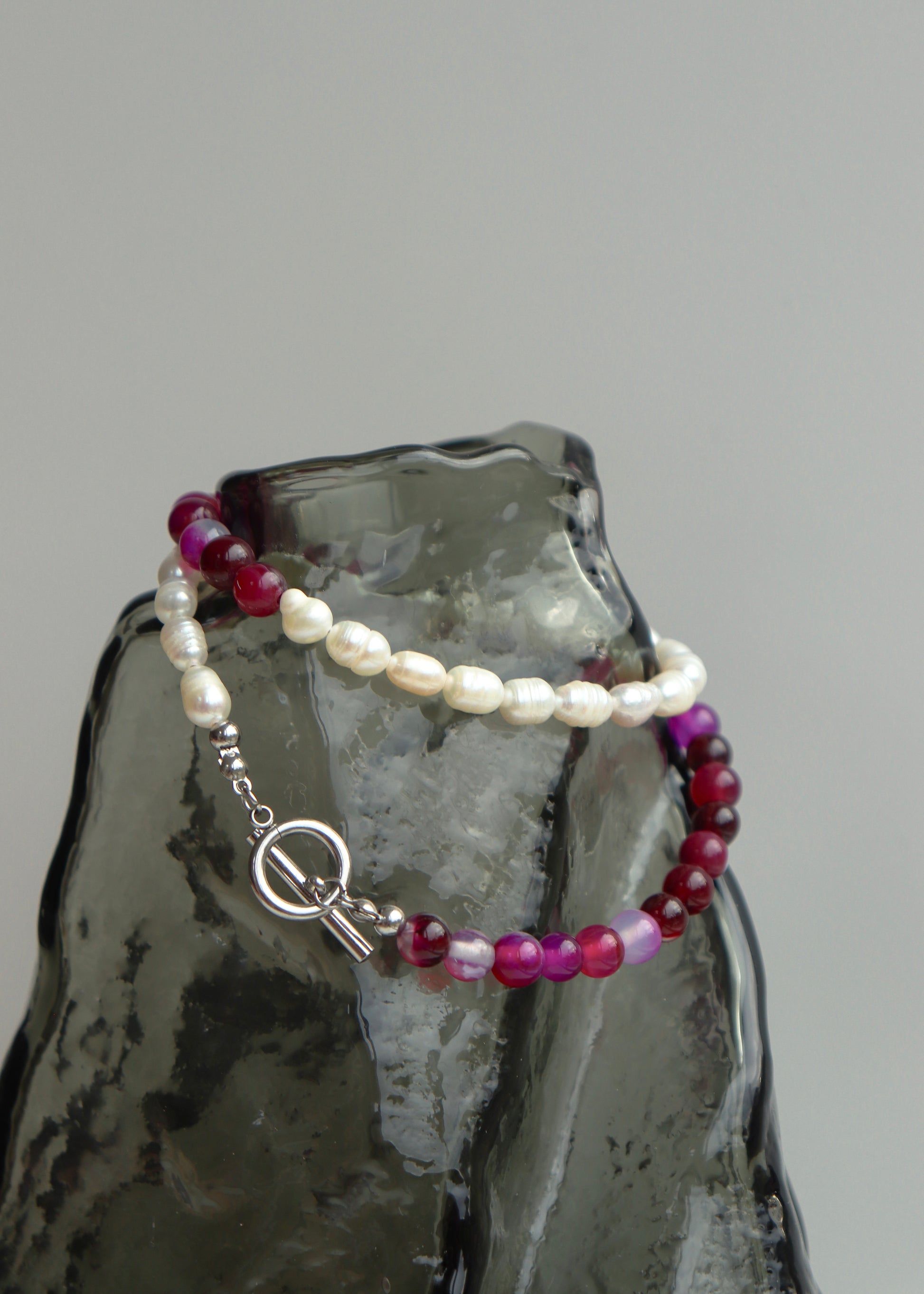 Ce collier élégant est une fusion raffinée de pierres d'agate naturelle rose et violet prune, puis de perles d'eau douce asymétriques lustrées.
