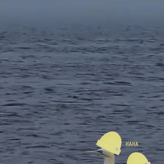 Inspired by the “fous de Bassan” that I had the chance to observe up close offshore during our zodiac trips in Carleton-sur-mer. Sitting in the small fishing zodiac, we could see and, above all, hear these birds diving in free fall and making a unique sound on the surface of the river. A real spectacle! Oh yes, their pale yellow heads give me the impression that they, too, are wearing our Clouts beanie haha.